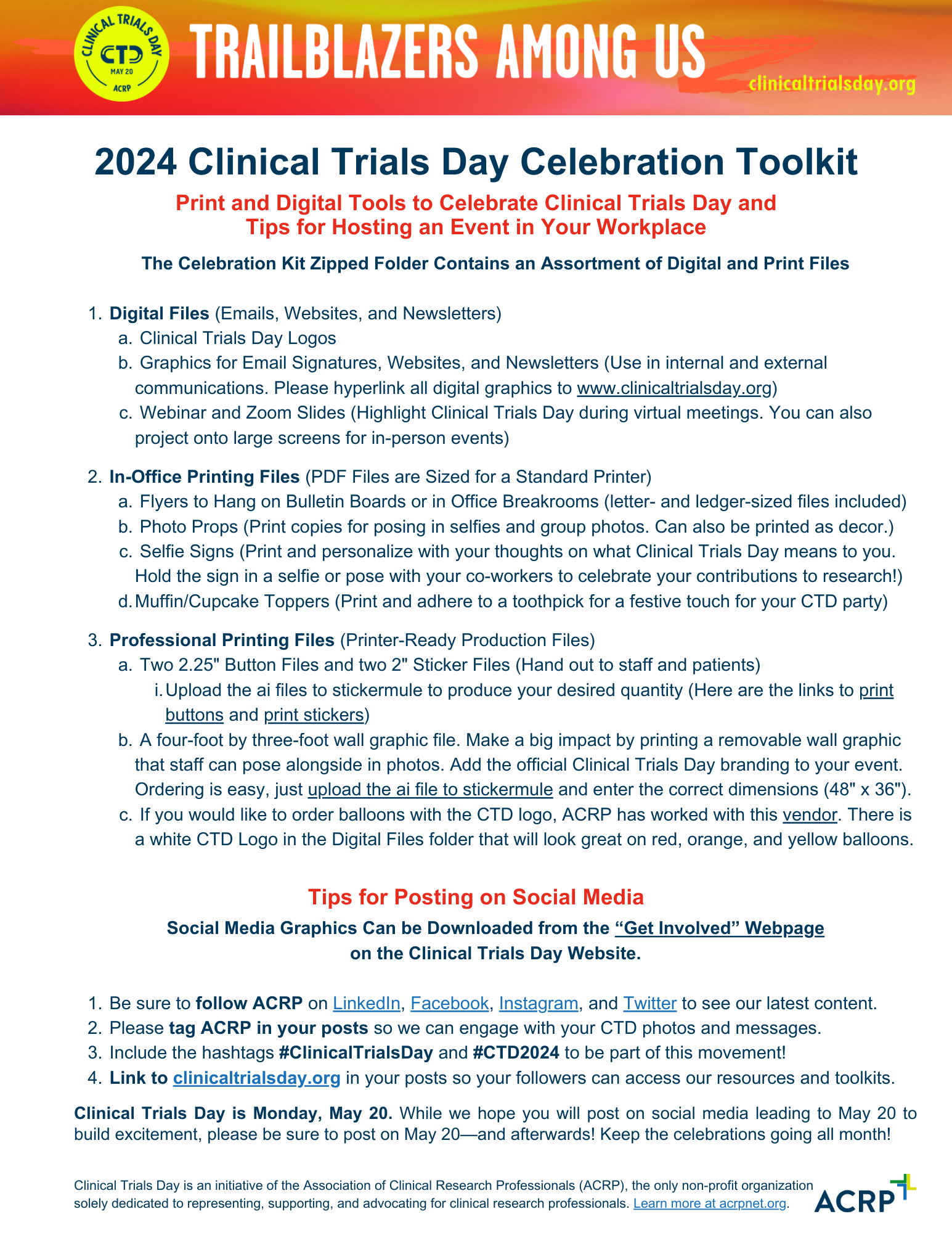 ACRP has everything you need to celebrate Clinical Trials Day online and in the office. Our Celebration Kits include selfie signs, poster files, digital graphics, and more—plus, you can download ‘ready-for-production’ files to order buttons and stickers to give to your teams. Each kit also includes tips for posting on social media and sharing your photos with ACRP.