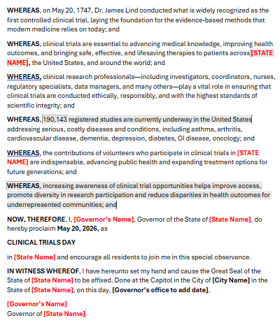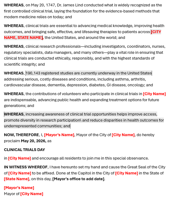 Proclamations also signal that a state values the advancement of science, patient safety, and innovation. By encouraging states to recognize May 20 as Clinical Trials Day, we shine a spotlight on the people who move research forward—and help expand awareness of how clinical trials improve health outcomes for everyone.